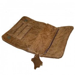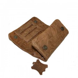 Blague à tabac cuir Mestango floral de coloris marron claire, intérieur vessie synthétique, pochette zip à l'avant pour filtres, emplacement papier cigarette.Fermeture par pressions aimantées. Dimensions:160x80mm.