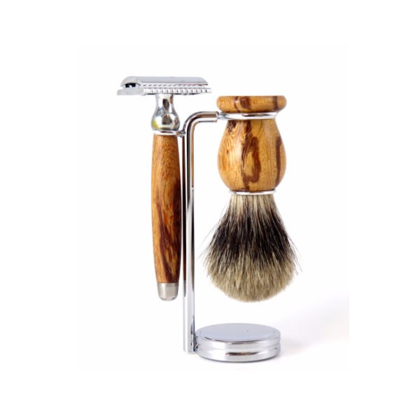 Set de rasage rasoir de sécurité et blaireau en bois de serpent.