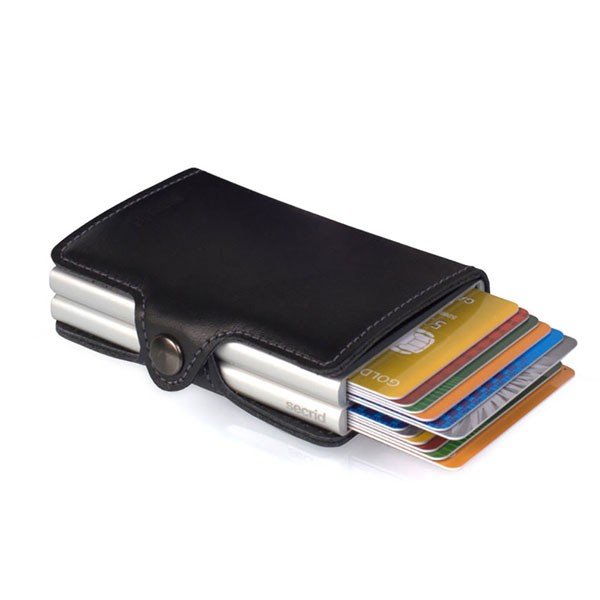 Le porte carte Secrid twinwallet se compose de deux cardprotectors dans un étui cuir avec une fermeture pression. Le twinwallet peut accueillir de 8 à 12 cartes sécurisées et offre également des emplacements pour d'autres cartes, reçus, billets et cartes de visite.